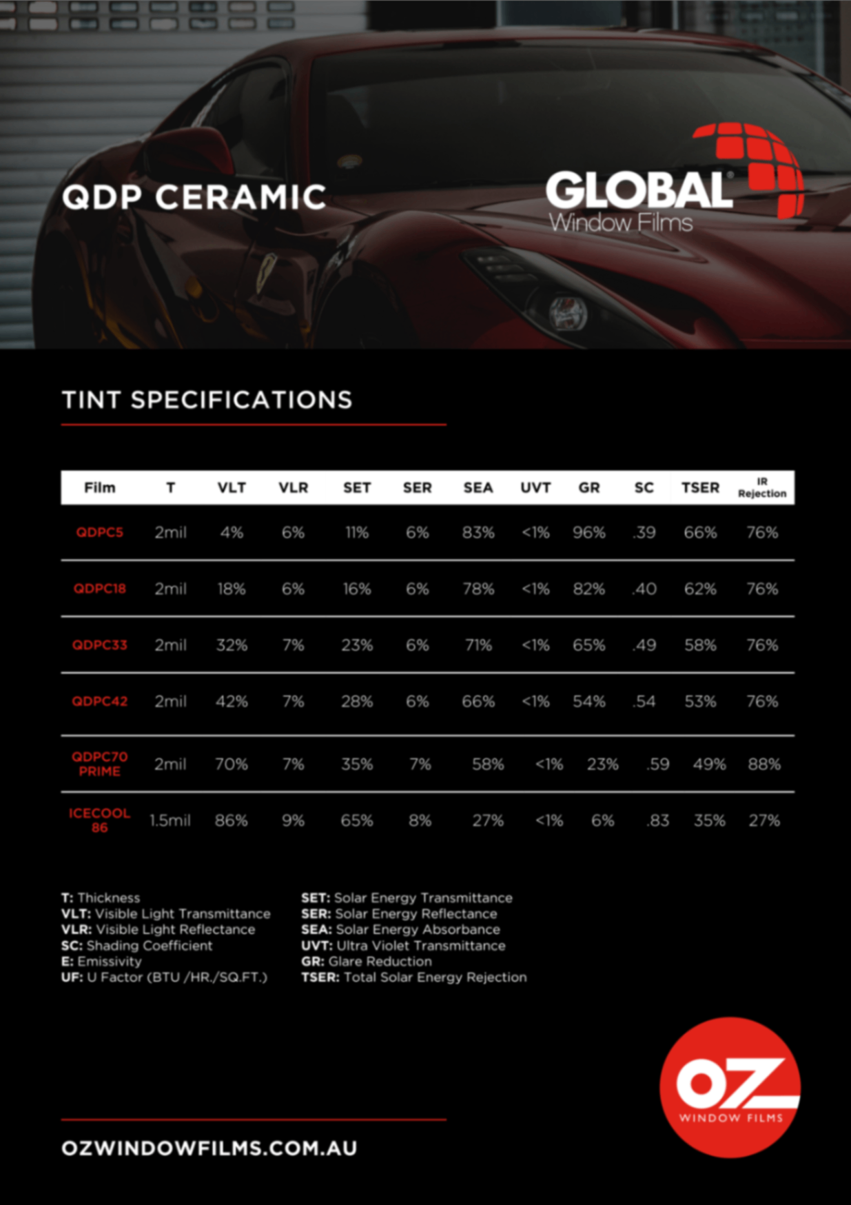 Global Window Films combines consumer demand with innovative technology by offering QDP Ceramic Charcoal non reflective automotive films. The QDP CERAMIC is the ultimate automotive window film from Global has it all: great looks, impressive performance and the protection of a lifetime limited warranty.