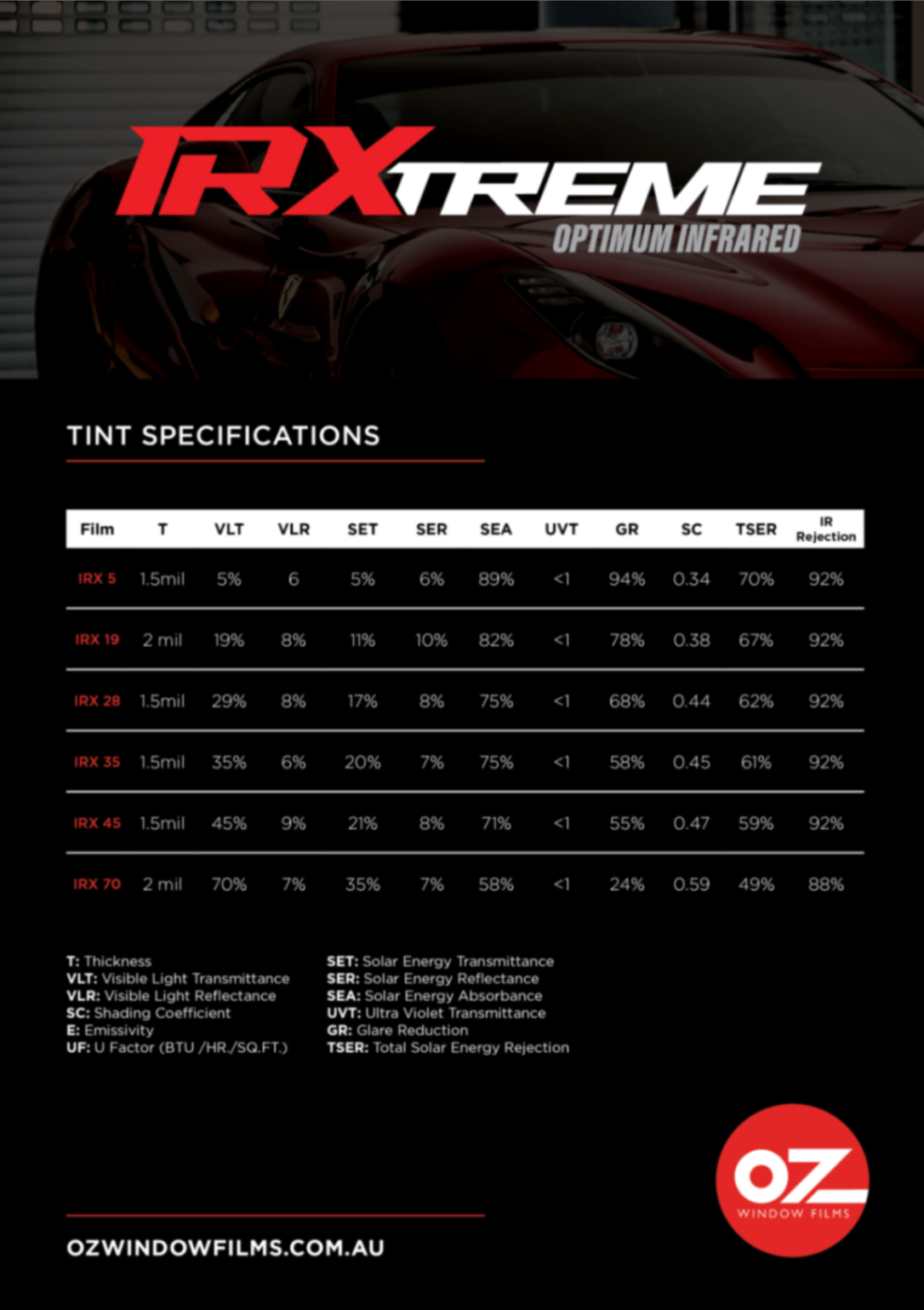 OZ Window Films offers IR Xtreme Premium Window Films exclusively. IR Xtreme offers it all: Impressive Optical Clarity, Looks and Extreme Performance backed with the protection of a lifetime limited warranty. The insistence on quality, constructed by the industry's most reliable manufacturer in world, IRX is built for performance and appearance.